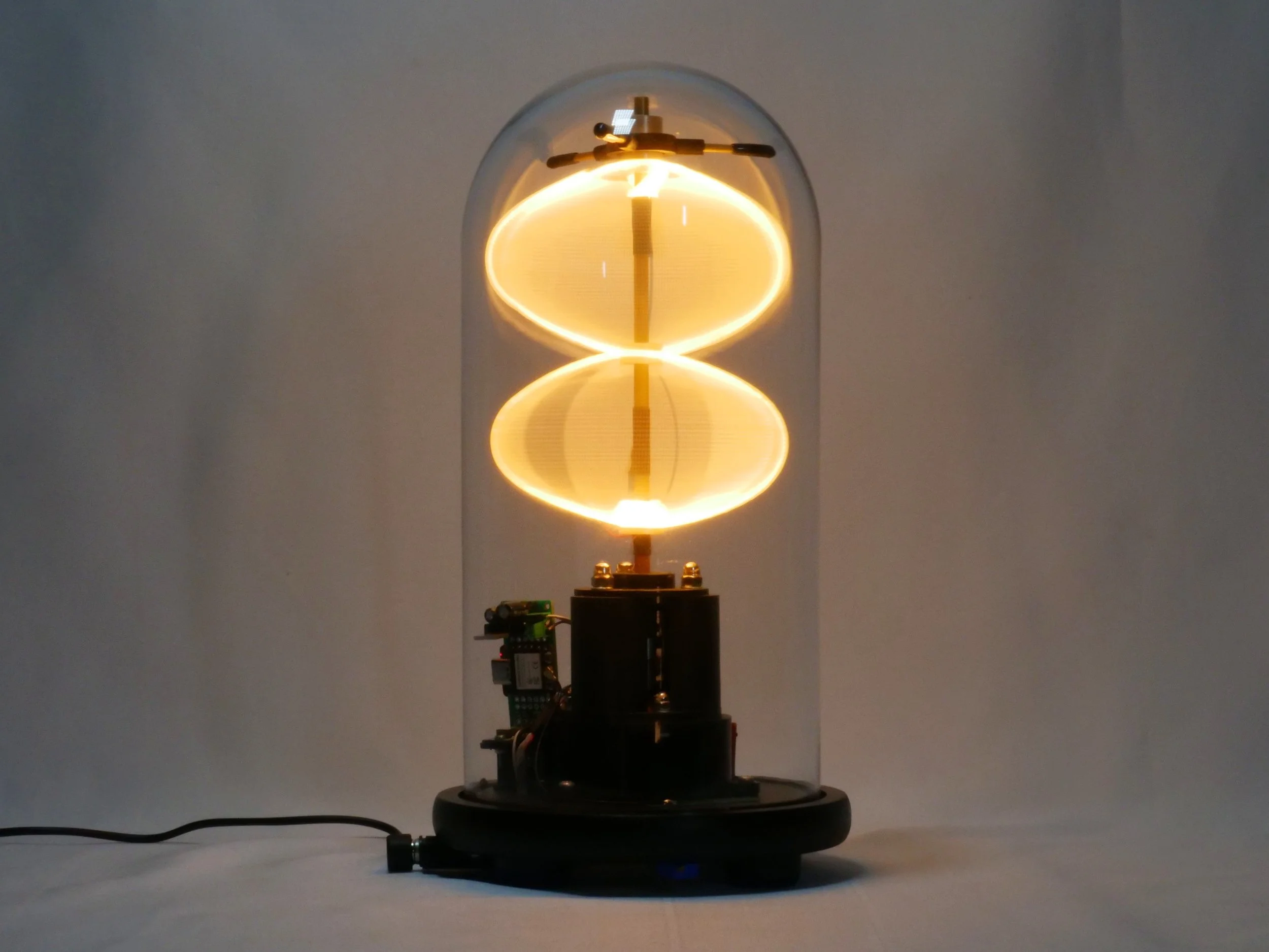 Angel Hair is a designed object, entirely custom built. The inspiration for the work is based on material experimentation using new forms of lighting technology. A flexible LED filament which behaves much like spaghetti takes a voluminous form of a figure 8 when powered. As the components are quite fragile, the mechanism is housed in a glass bell for protection. The name Angel Hair is given to emphasize the fragility of the work and the noodle-like character of the LED filament itself.