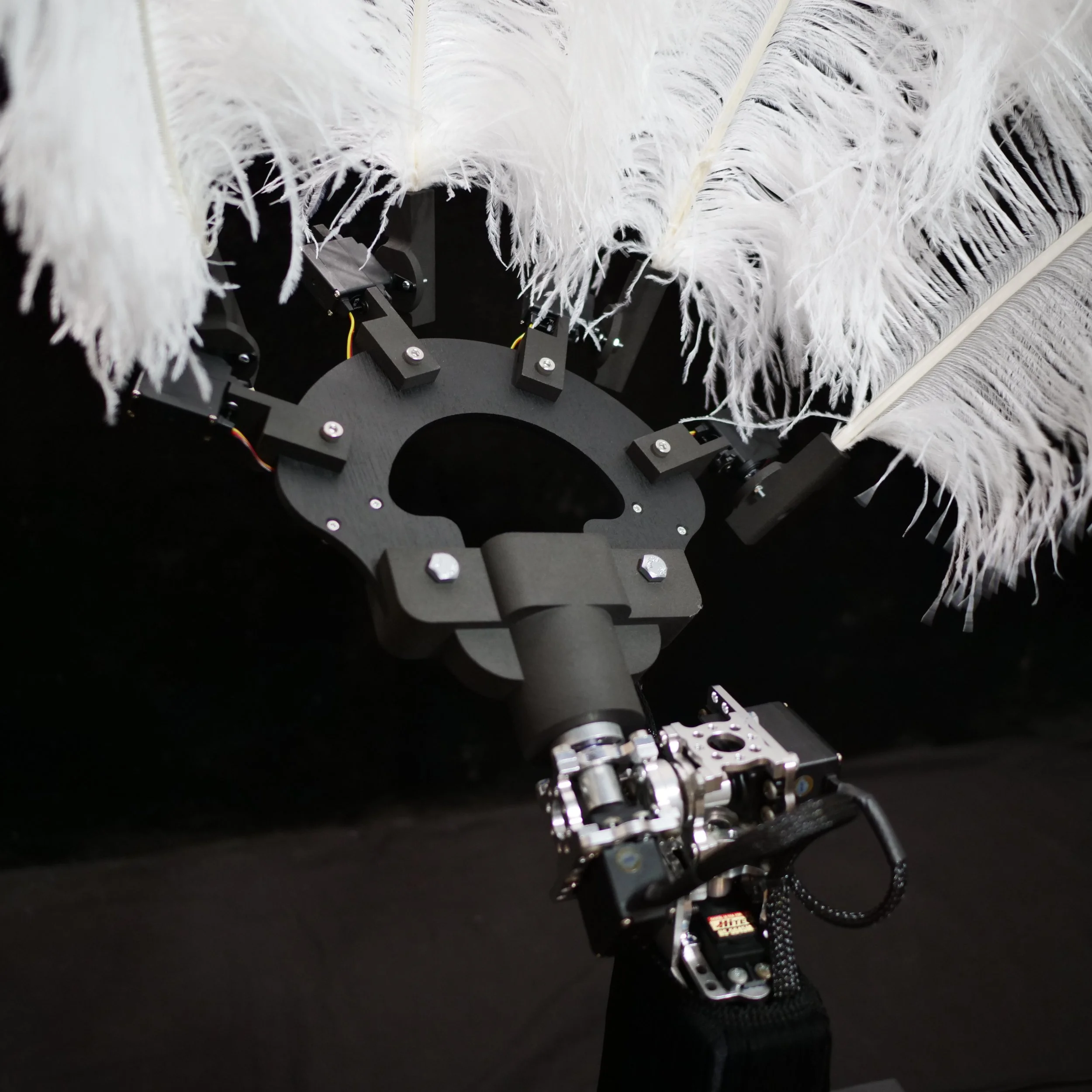 materials: ostrich feathers · nylon · aluminum · wood · custom electronics · glove · sensors · servo motors