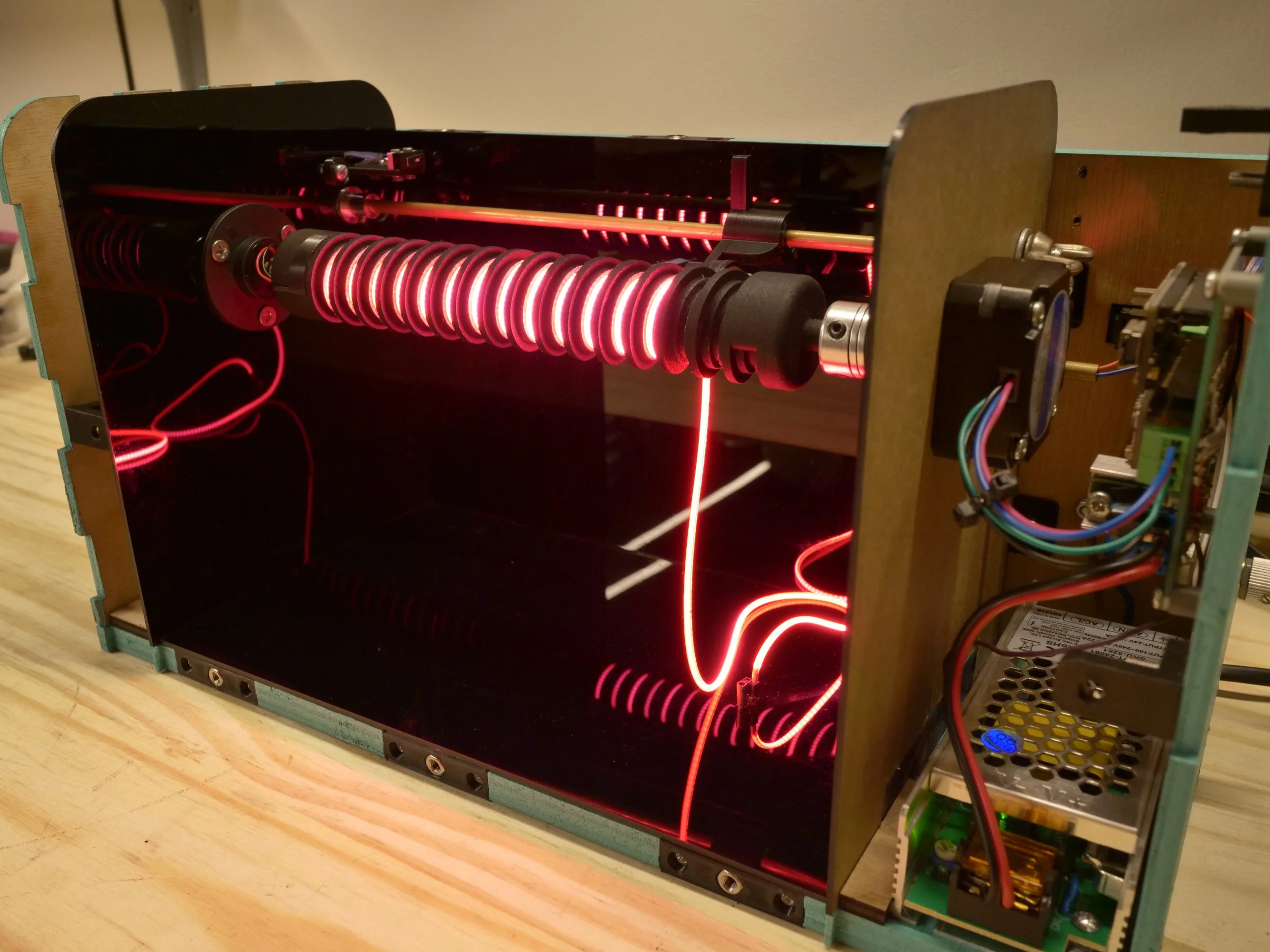 materials: LED filament · laser cut wood and acrylic · aluminum · stepper motor · custom electronics · Arduino